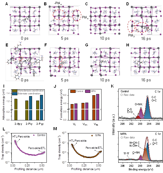 图2 MPA策略功能机制的理论模拟和实验验证。(A至D)对照薄膜在423 K模拟热退火条件下的快照。(E至H)MPA处理薄膜在423 K模拟热退火条件下的快照,揭示了增强的结构稳定性和降低的动态无序性。(I)具有不同配位基序的配体工程化吡啶基分子在钙钛矿表面的吸附能。(J)对照薄膜和MPA处理薄膜中空位缺陷的形成能。(K)退火后对照薄膜和MPA处理薄膜的C 1s高分辨率XPS谱图。(L)和(M)分别为对照组和经MPA处理组钙钛矿太阳能电池的深度依赖性陷阱密度分布图。