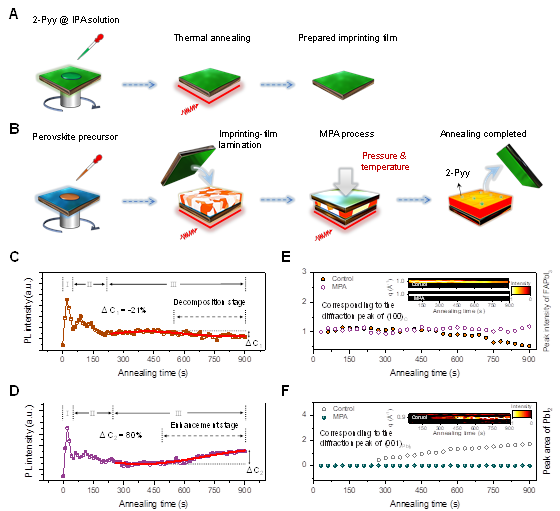 图1 MPA工艺及钙钛矿薄膜退火过程中的实时表征。(A)2-Pyy压印薄膜的制备过程。(B)钙钛矿退火过程中MPA的工艺流程。(C)和(D)分别为基于对照组和MPA处理组的钙钛矿薄膜的原位光致发光强度随退火时间的变化曲线。(E)对照组和MPA处理组FAPbI3钙钛矿衍射峰的时间分辨原位XRD强度演变曲线。插图为强度映射图像。(F)PbI2衍射峰的积分强度随时间的变化。