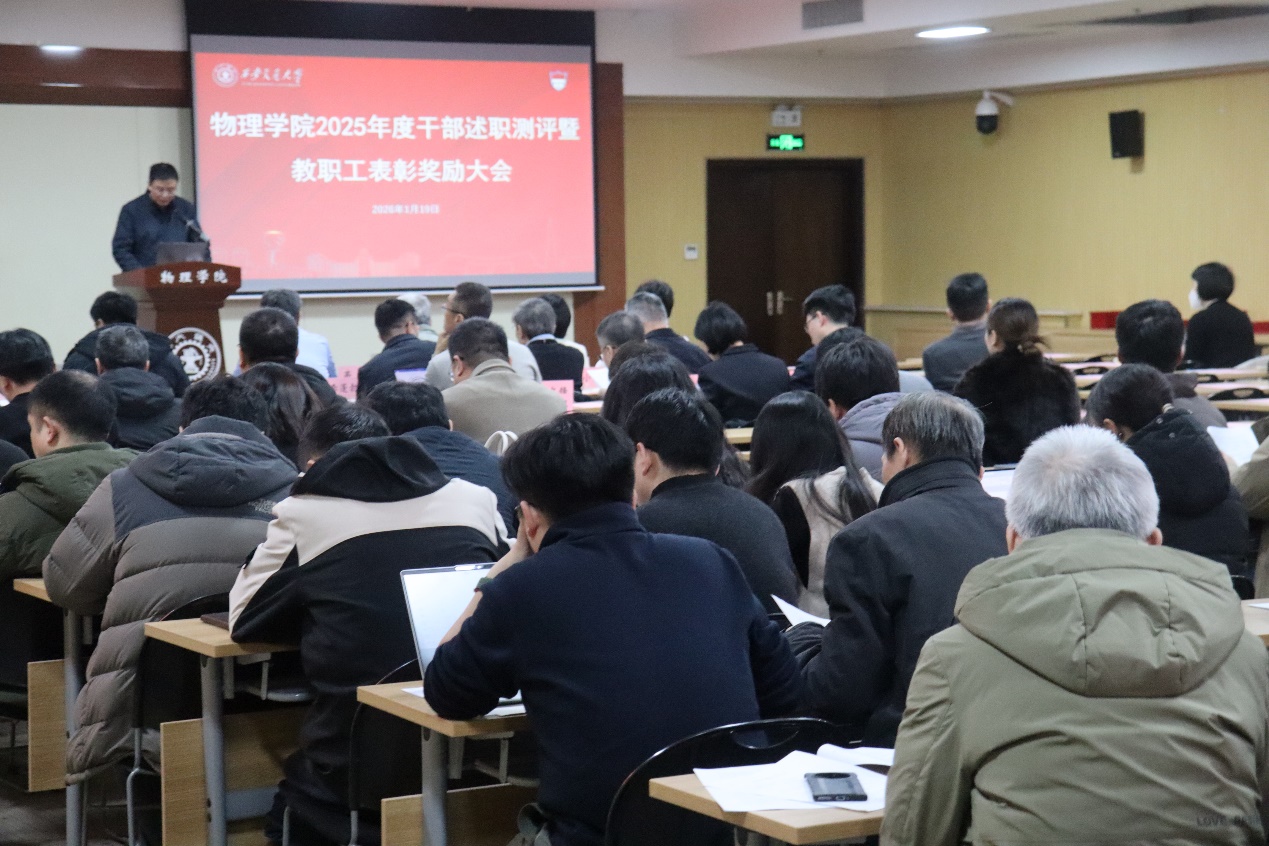 1月19日,物理学院召开2025年度干部述职测评暨教职工表彰奖励大会。全体教职工参加会议,会议由党委副书记张沛主持。