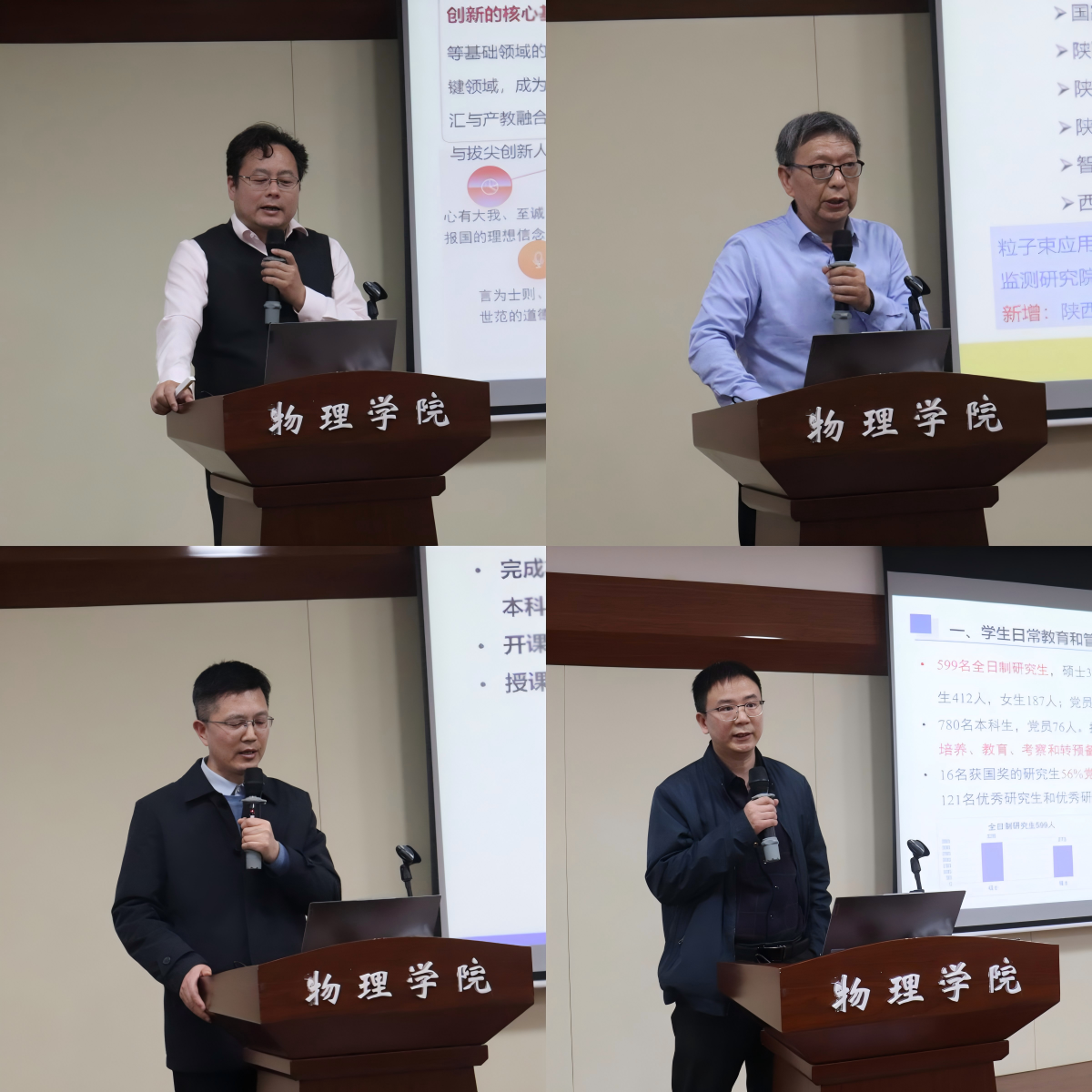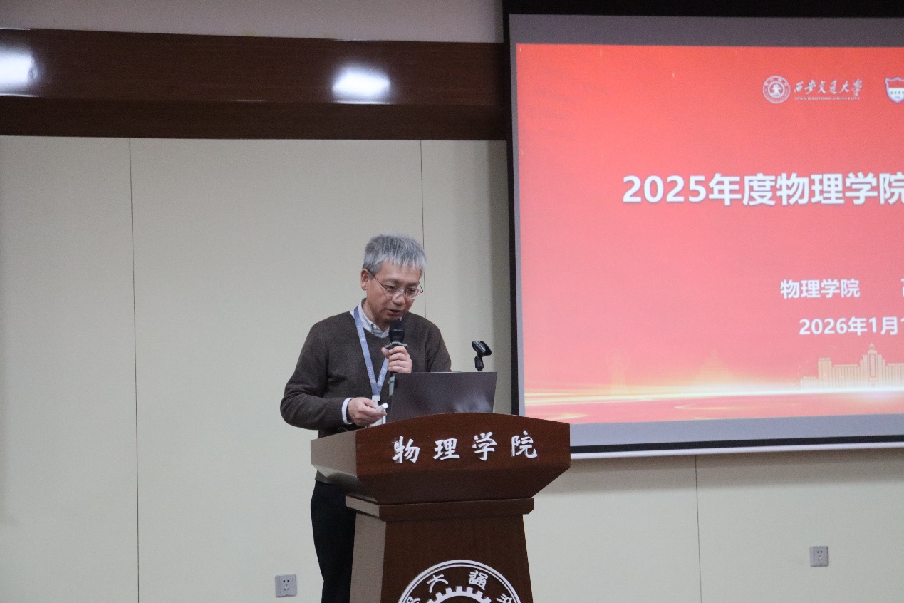 副院长赵永涛以“聚焦质量 改革创新 推动物理学科高质量发展”为题,汇报在政治理论学习、分管工作完成和推进情况、分管工作业绩增量以及廉洁报告等方面的情况。副院长杨志懋汇报科研基地建设、科研平台运行、科研项目及到款和标志性科研成果等情况。副院长李蓬勃汇报2025年教学基本工作,着重介绍在教改项目、教材建设、教学获奖以及人才培养标志性业绩等工作情况。党委副书记张沛汇报在学生教育管理、纪检、文化宣传等方面的主要工作。