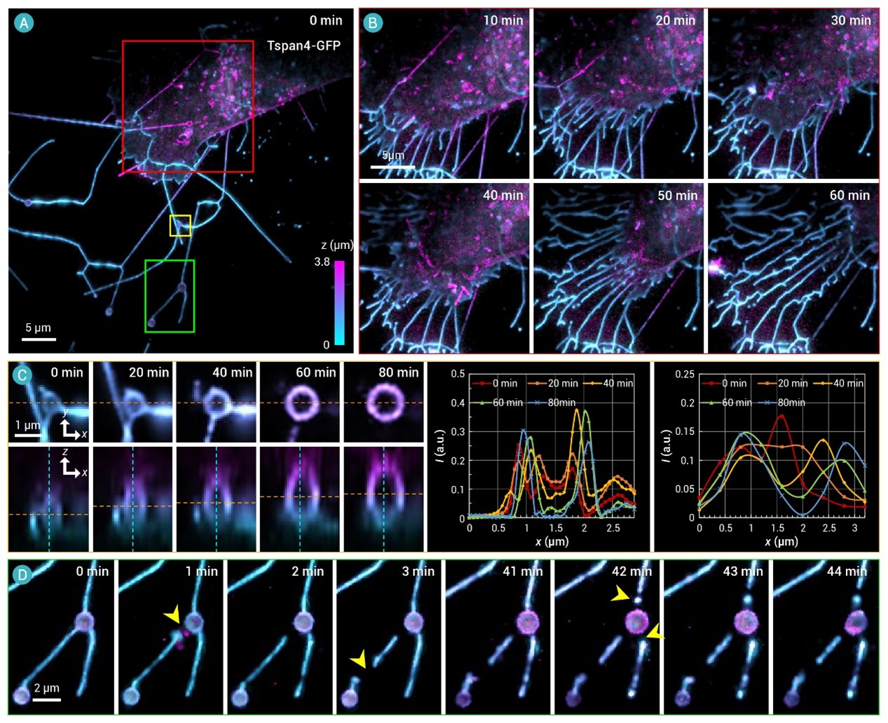 效果如何?令人惊喜的是,这项技术能将图像的信噪比提升约10分贝,成像深度直接翻倍(图2B-D)。用它观察经过透明化处理的老鼠大脑,穿透深度能达到惊人的2.4毫米。无论是小鼠脑中密密麻麻的神经元(图3)、果蝇大脑里调控昼夜节律的时钟神经元,还是人类结肠类器官的精细结构,都展现出了前所未有的清晰度。更重要的是,它依然保持着OS-SIM“温柔”的本色。使用极低的光照,他们成功记录下了活细胞中线粒体长达5分钟的3D动态变化(包括融合与分裂),以及迁移体——一种在细胞迁移过程中产生的新细胞器——长达80分钟的生长和脱落全过程(图4)。