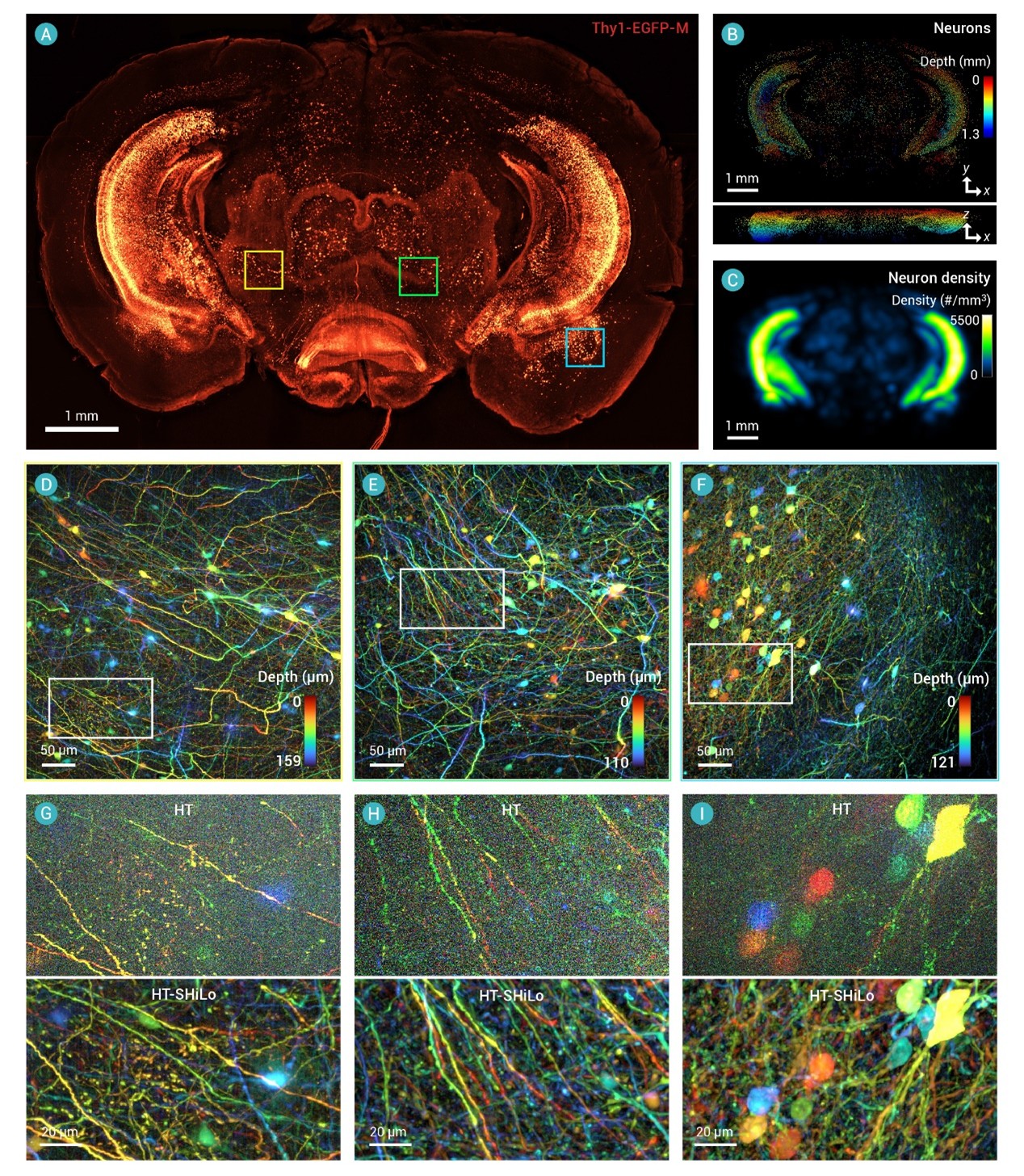 图3 组织透明化的小鼠脑切片中神经与神经元的三维图像。(A)全脑切片的最大强度投影(MIP)图像。(B)检测到的神经元三维分布图。(C)神经元密度分布图(单位:个/mm³)。(D-F)图A中对应区域的高度伪彩MIP图像。(G-I)图D-F中放大区域的HT算法与HT-SHiLo算法成像效果对比。