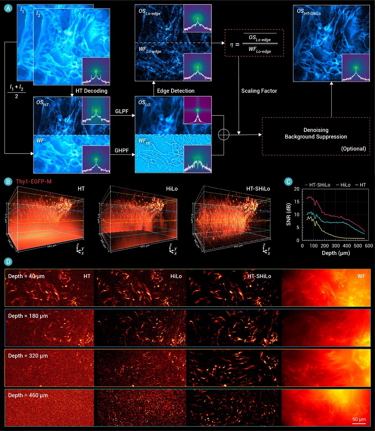 这就是当前领域面临的核心科学问题:如何在保持OS-SIM高速、低毒优势的同时,突破厚组织带来的信噪比瓶颈,实现更深、更清晰的3D成像?针对这个难题,最近西安交通大学物理学院雷铭团队开发了一套全新的策略——“HT-SHiLo”(图2A)。它不像传统方法那样“硬啃”那些已经变模糊的条纹信息,而是采取了一套组合拳: