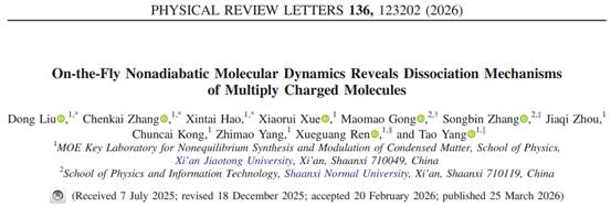 该成果以《即时非绝热分子动力学揭示多电荷分子解离机制》(On-the-Fly Non-adiabatic Molecular Dynamics Reveals Dissociation Mechanisms of Multiply-Charged Molecules)为题发表于《物理评论快报》(Physical Review Letters)期刊。西安交通大学物理学院为该论文的第一完成单位。西安交通大学物理学院博士生刘栋为论文第一作者,博士生张晨锴和郝鑫泰为论文共同第一作者,杨涛特聘研究员、任雪光教授,陕西师范大学张松斌教授及宫毛毛副教授为论文共同通讯作者。研究工作得到了西安交通大学杨志懋教授和孔春才教授给予的重要指导。该研究获得了国家自然科学基金、陕西省自然科学基础研究计划以及中央高校基本科研业务费的支持。