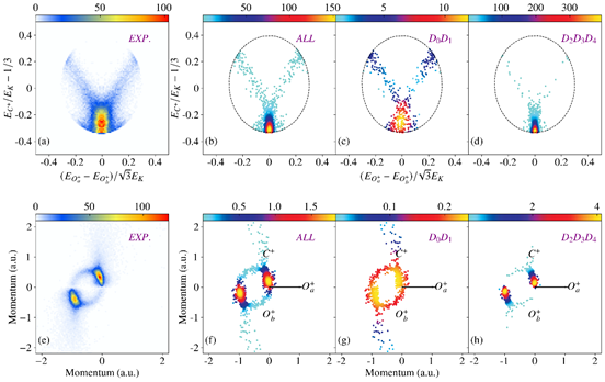 的库伦爆炸成像过程为研究对象,通过理论模拟结合实验观测的研究方法,阐明了初始激发态及多态耦合对于解离动力学机制的影响规律,即低激发态主要诱导伴随中间产物的次序三体解离,而高激发态则主导直接的协同三体解离过程。理论模拟所获得的动能释放谱、达里兹图、牛顿图等图谱不仅能高度复现实验观测结果,也实现了对实验重叠光谱特征的态分辨解析。上述研究将推进基于非绝热理论的激发态分子解离动力学过程模拟方法的发展,也将促进对复杂多体关联效应和化学反应机制的深入理解。