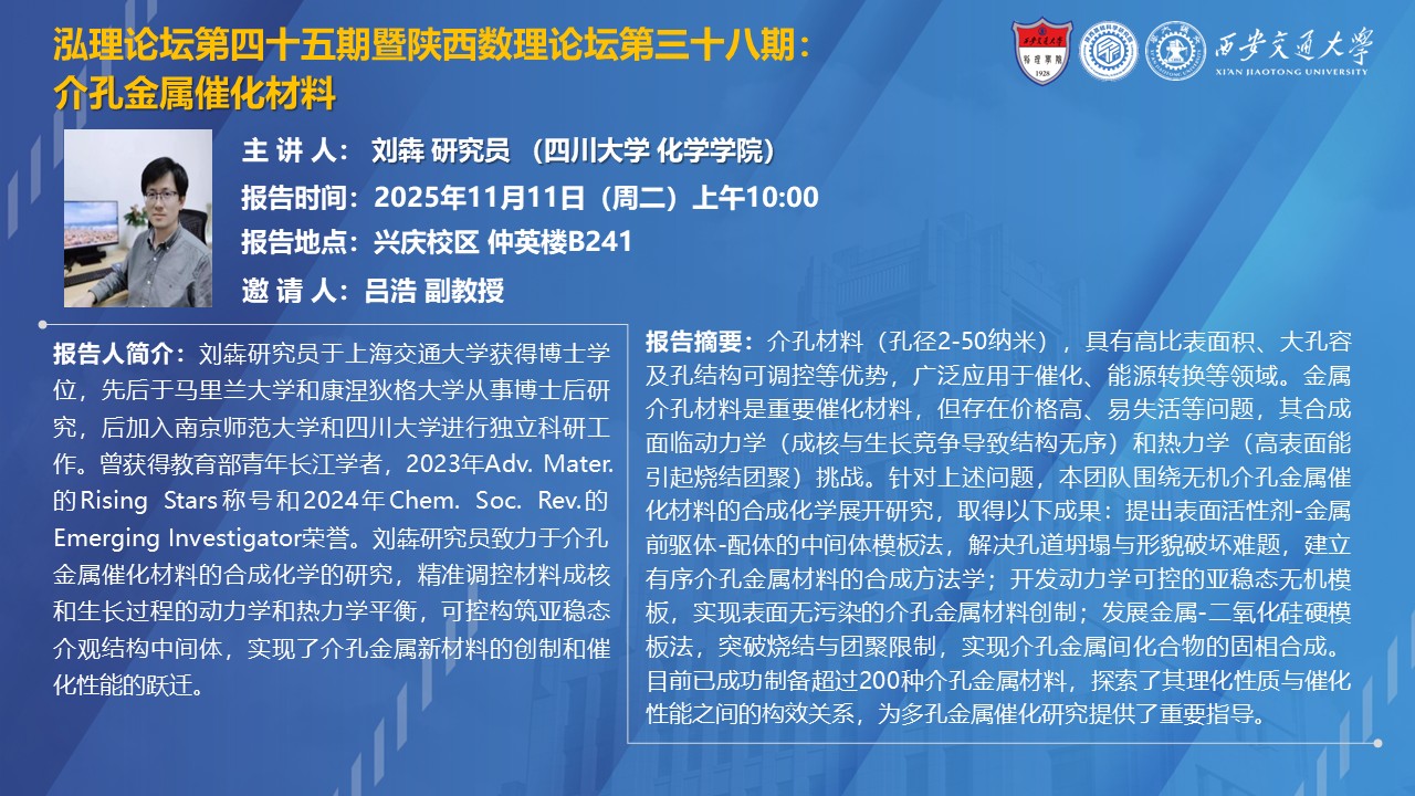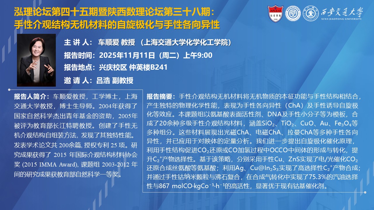 【泓理论坛第四十五期暨陕西数理论坛第三十八期】——手性介观结构无机材料的自旋极化与手性各向异性、介孔金属催化材料